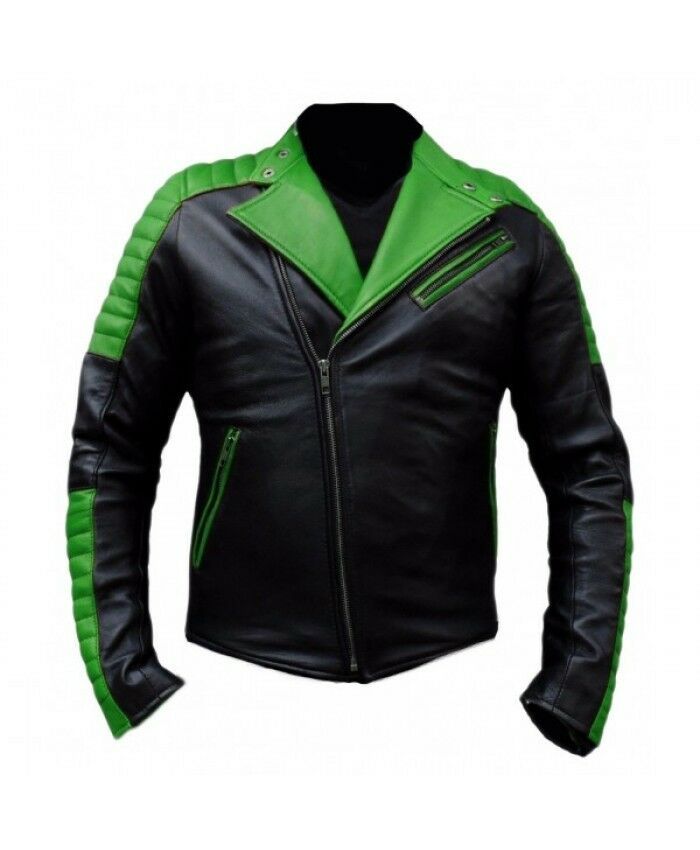 Men's Two Tone Black Green Contrast Motorcycle Padded Vintage Leather Jacket