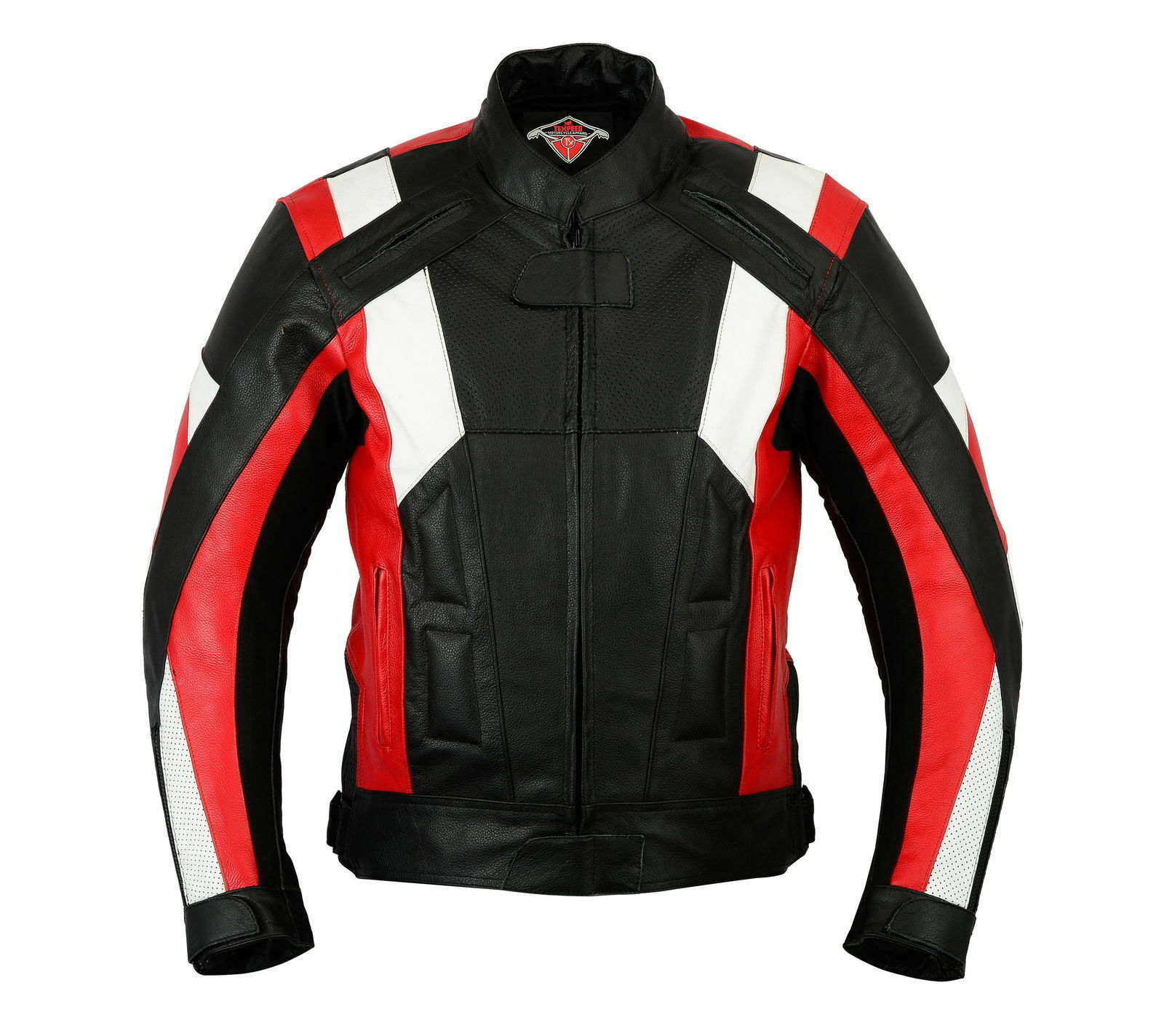 Men Three Tone Red White Black Motorcycle Genuine Leather Safety Pads jacket