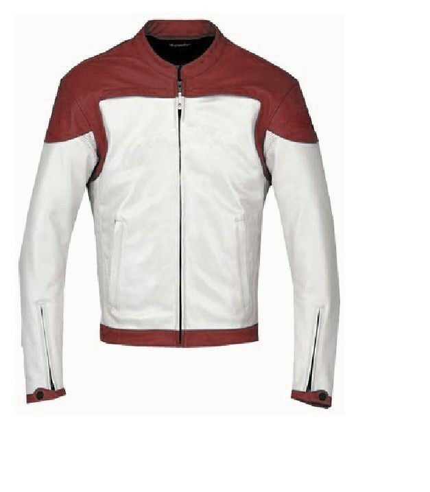 Men White & Maroon Contrast Motor Biker Custom Genuine Leather Safety Pad Jacket