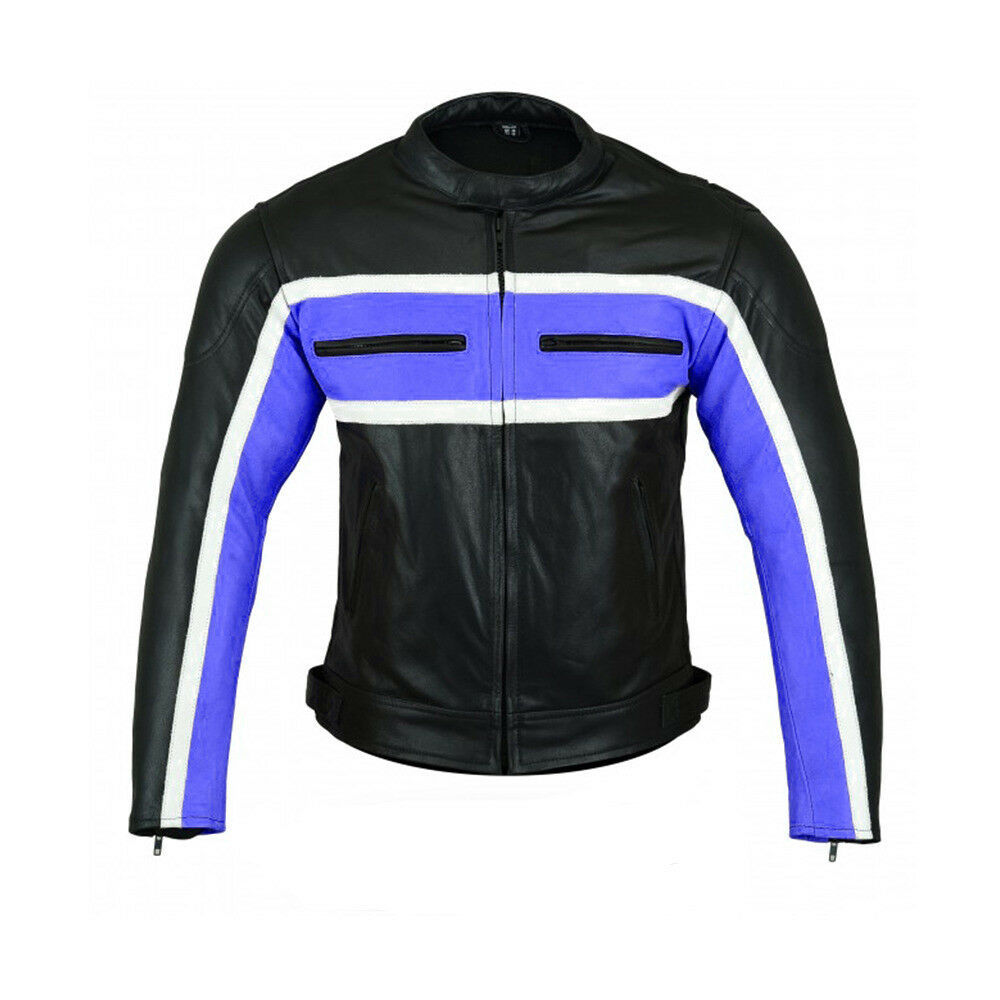 Men Black Blue Contrast Biker White Stripes Genuine Leather Safety Pads Jacket