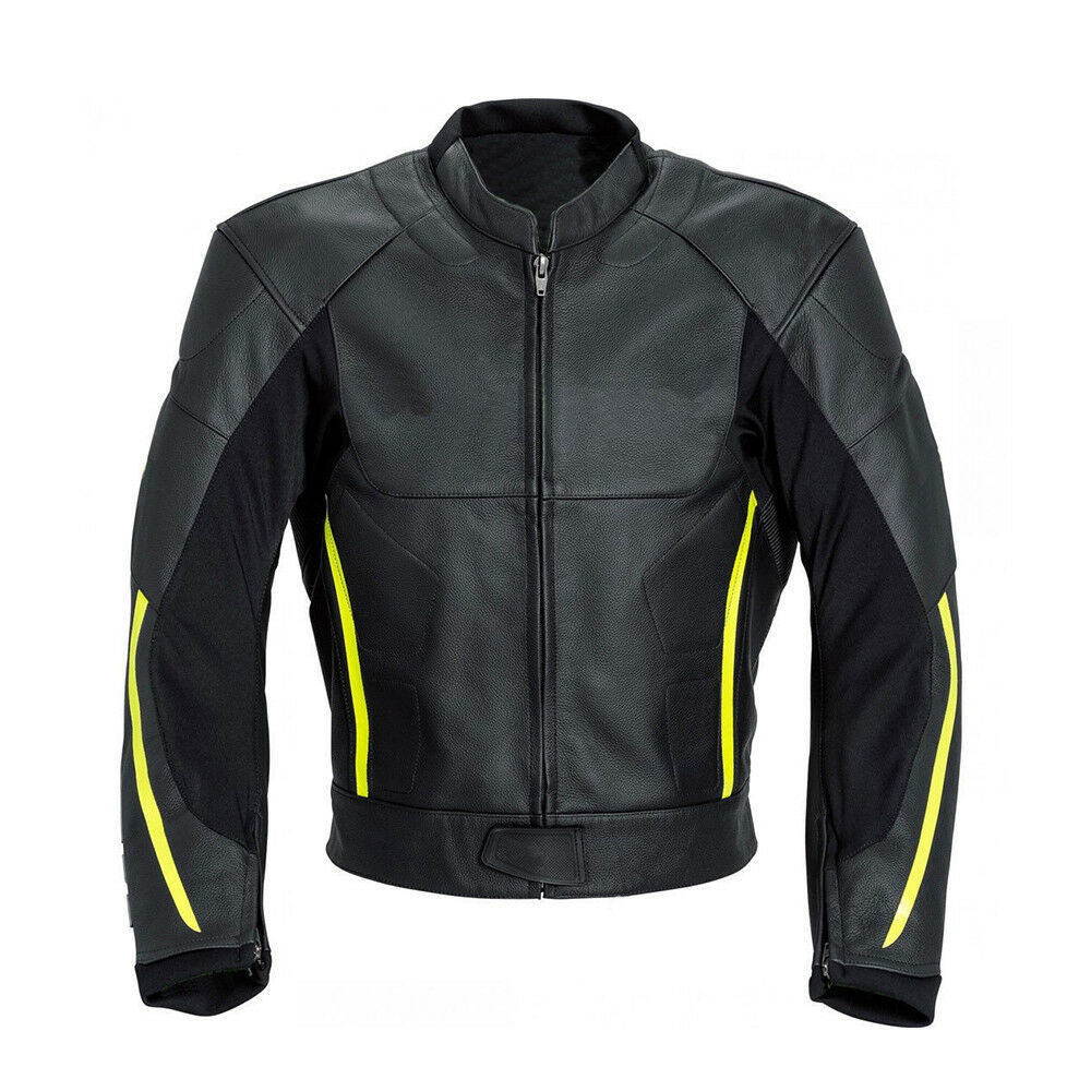 Men Black Motor Biker Yellow Stripes Genuine Cowhide Leather Safety Pads Jacket
