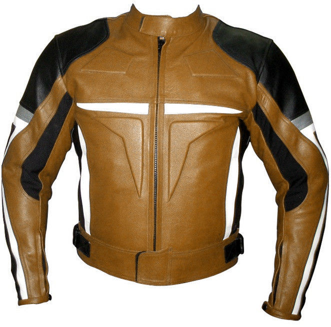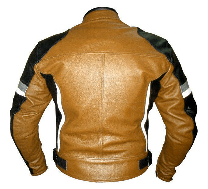 Men Black Brown White Contrast Motor Cycle Genuine Leather Safety Pads Jacket