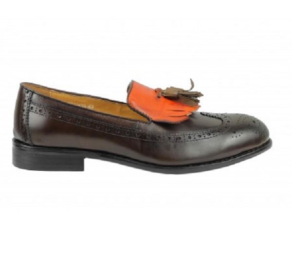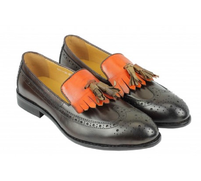Men Two Tone Orange Black Loafer Tassel Genuine Leather Wing Tip Fringed Brogue Toe Handmade Shoes