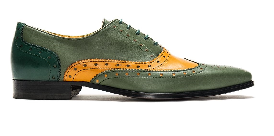 Oxford Two Tone Tan Green Wing Tip Full Brogue Toe Real Cowhide Leather Lace Up Footwear Shoes