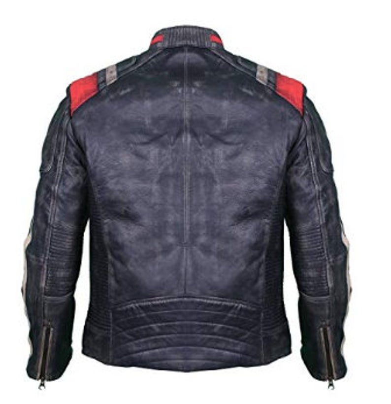 Vintage Cafe Racer Retro Motorcycle Distressed Biker Leather Jacket Red & White Stripes