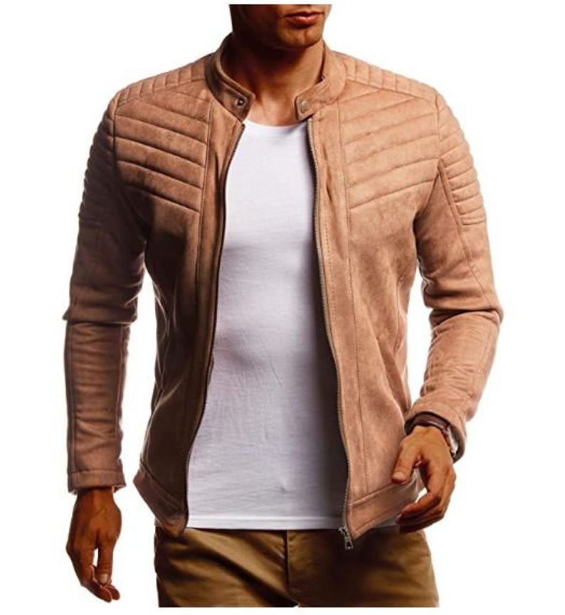 Men's Beige Biker casual quilted transition summer velvet stand-up collar faux leather jacket