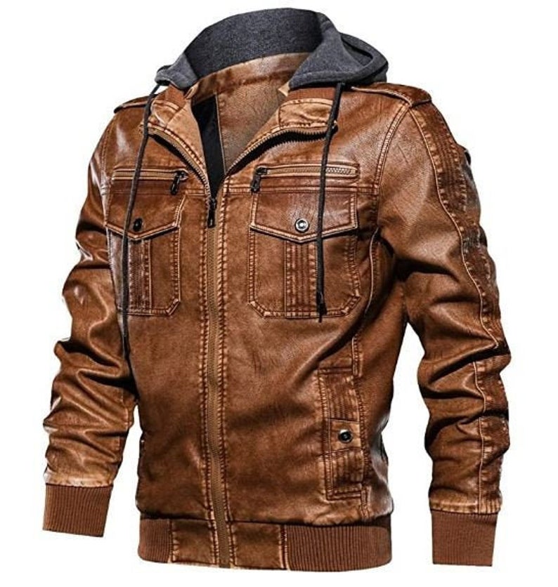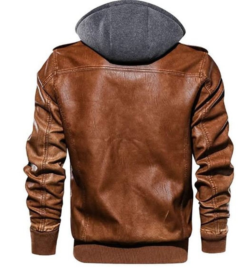 Men's Brown Biker Motorcycle Stand up color Winter Slim Fit Removable Hood Faux Leather Jacket