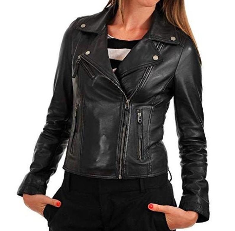 Moto Biker Lambskin Leather Jacket for Women's Zipper closure Stylish Slimfit Black