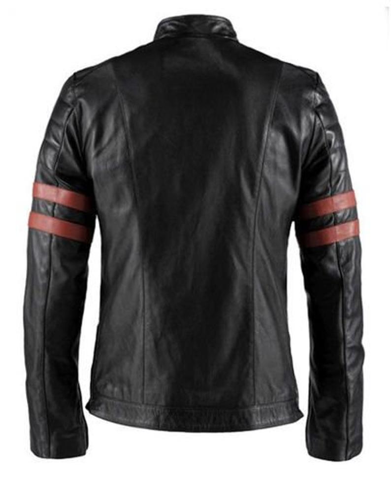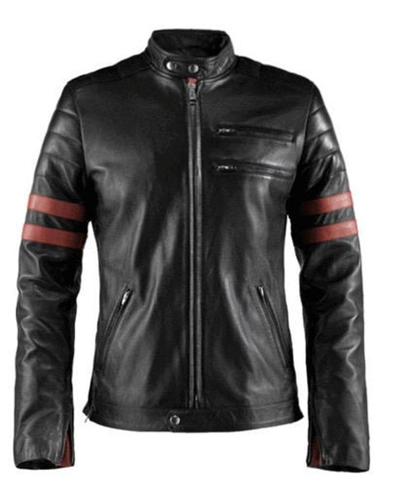 Men's Retro Fight Club Hybrid Biker Black Faux Leather Jacket with Red Stripes