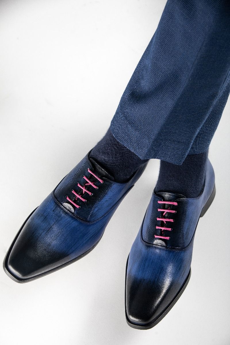 Blue Patina Hand Painted Genuine Leather Burnished Derby Handmade Pink Laces Formal Dress Shoes