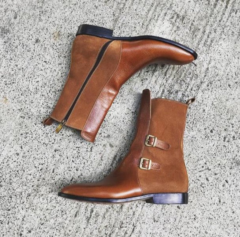 New Handmade Pure Brown Leather & Brown Suede Tow Buckle Side Zip Ankle Boots for Men's