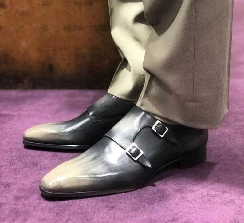 Pure Handmade Leather Gray Black Shaded Monk Strap Shoes for Men's